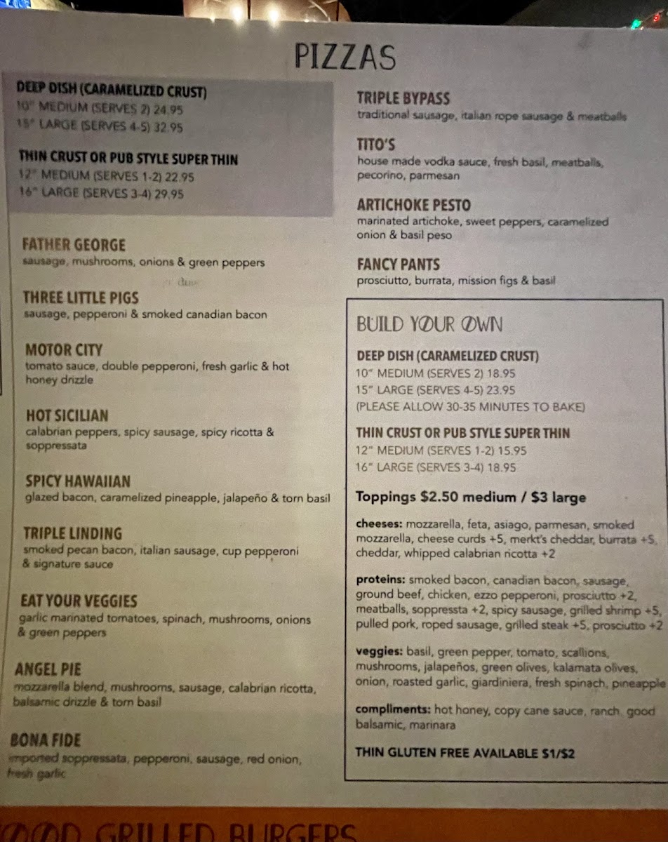 Mushrooms, pepperoni, ham, tomato, onion, green pepper, black olive, pineapple, bacon, beef, and shrimp on a thin crust.