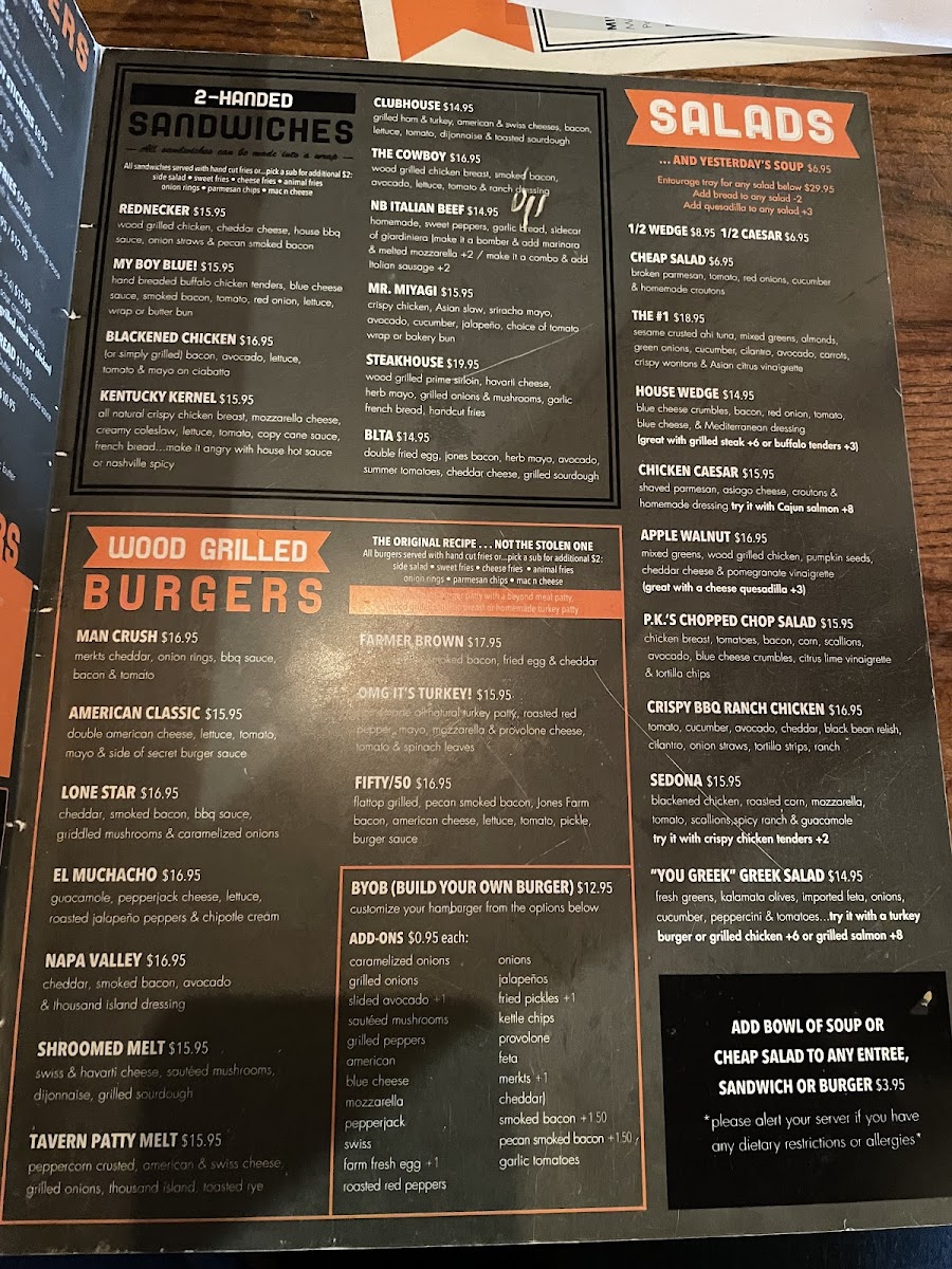 Lone star burger with a variety of patty options, including beef (different doneness), turkey, grilled or crispy chicken, salmon, shrimp, and plant-based.
