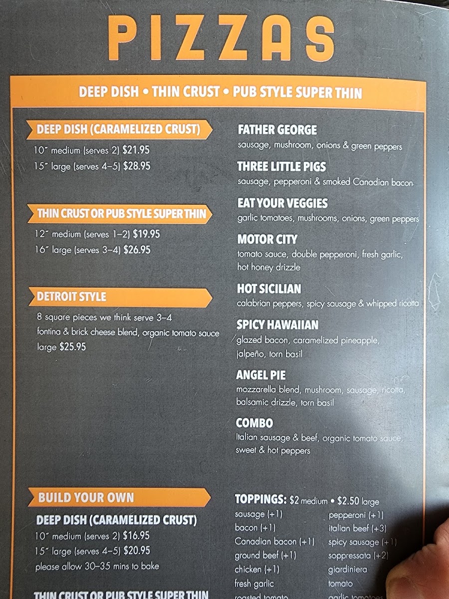 Light, flaky crust that's golden and crisp, typically includes cheese, mushrooms, onions, green peppers, and sausage.