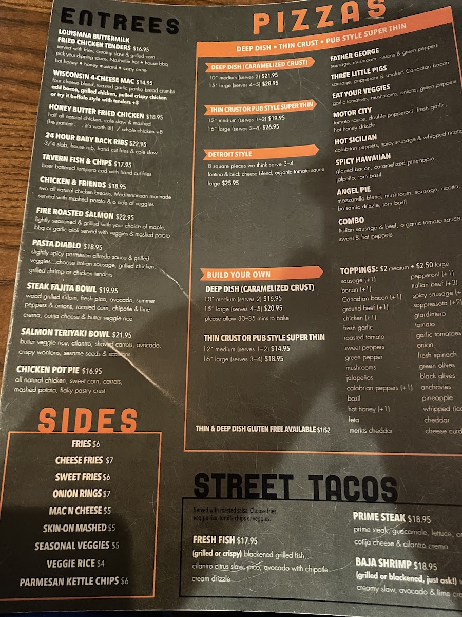 Chicken pizza with your choice of two sides. Sides include fries, salads, soups, vegetables, and other options.